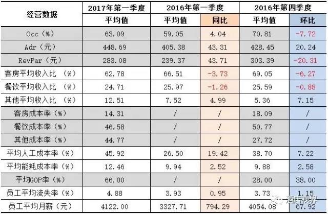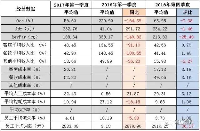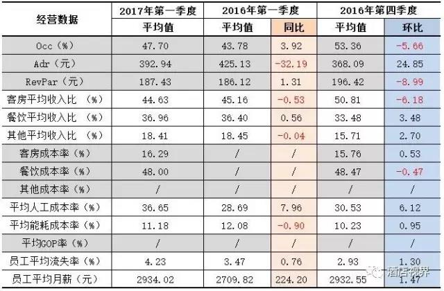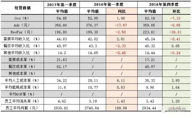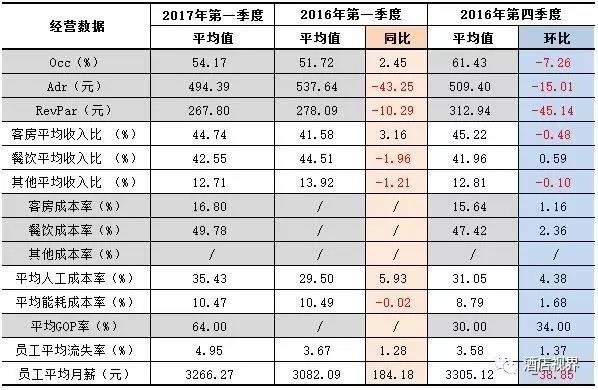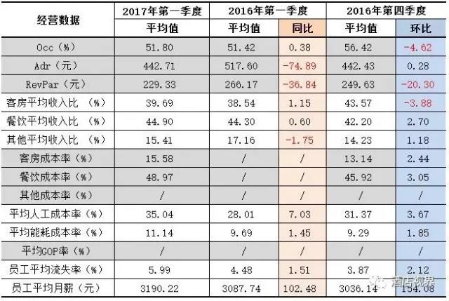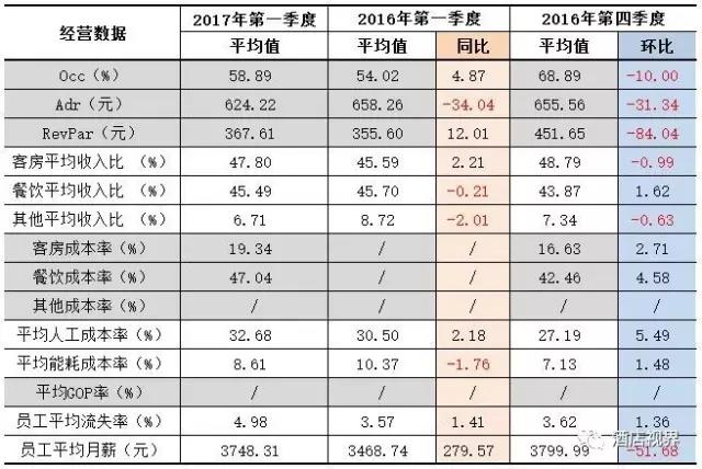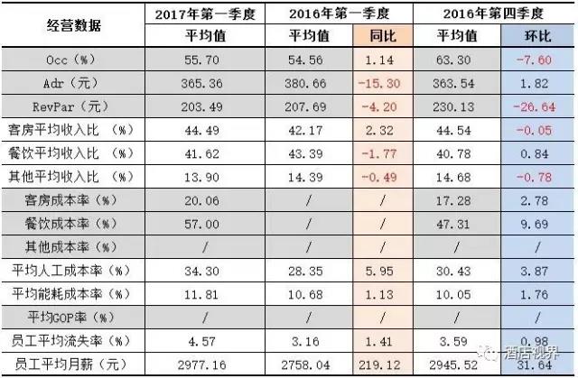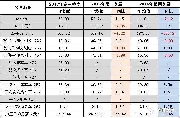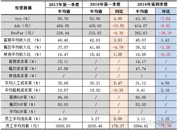 2017年第一季度国内星级饭店平均出租率54.85%,平均房价358.80元,每间可供房收入196.80元;平均房价及每间可供房收入均有所下降。