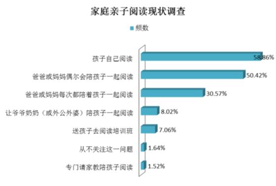 亲子阅读被认为是亲子关系培养的有效途径,到底有多少父母经常陪伴自己的孩子阅读?《报告》针对该话题的调查数据显示,有30.57%的受访家长能够经常陪伴孩子阅读,多数家庭更多时候是让孩子自己阅读?!侗ǜ妗贩治鋈衔鬃釉亩恋谋壤胱优哪炅涿芮邢喙?,学龄前儿童由父母陪伴阅读的比例相对较高,而子女已入学(小学或初中)的家长则更多地让孩子自行阅读。调查中,也有少部分家庭的孩子经常由爷爷奶奶或外公外婆陪伴阅读。