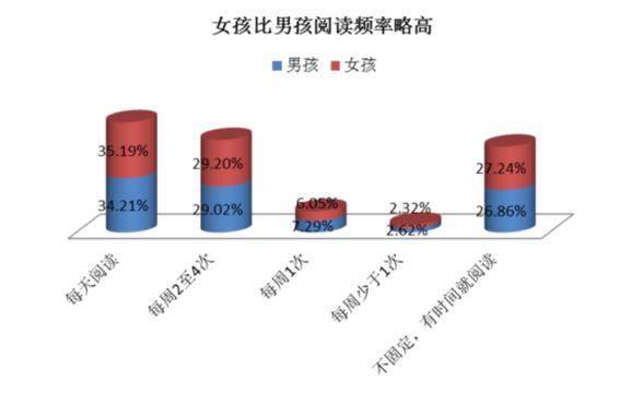 《报告》提供的调查数据分析显示,独生子女能够坚持每天阅读的比例明显高于非独生子女,家庭子女数量越多,子女阅读频率就相对更低。另外,女孩保持高频率阅读的比例略高于男孩。